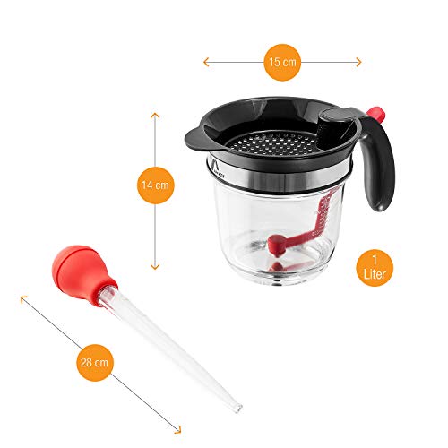 Fettkanne aus Kunststoff mit integriertem Sieb und Messskala für das Abschöpfen von Fett aus Soßen und Suppen