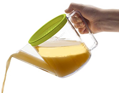 Kochen Sie eine leckere Bratensoße, ist im heißen Zustand das Fett mit dem Rest vermischt. Nun geben Sie die Soße in die Kanne. Nach einiger Zeit wird sich das Fett oben absetzen und die fettreduzierte Soße bleibt unten zurück. Da sich der Ausgießer unten befindet, können Sie die fettarme Flüssigkeit ausschenken und das Fett bleibt in der Kanne zurück. Die Fetttrennkanne ist aus Kunststoff. Sie hat ein Fassungsvermögen von einem Liter bzw. 1000 ml (entspricht ungefähr vier Tassen). Die Skala lässt sich auf dem durchsichtigem Behälter gut ablesen. Die Kanne hat ein Sieb. So können Sie Flüssigkeiten zusätzlich filtern. Auch heiße Soßen und Fonds sind kein Problem, denn die Fetttrennkanne ist hitzebeständig. Perfekt für eine fettreduzierte Ernährung!
